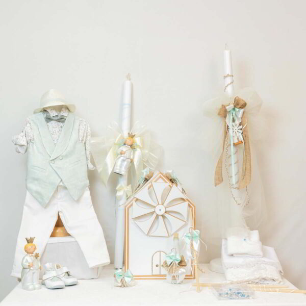 Baby Moda Baptism Suit with complete set including handmade leather shoes, baptism candle, oil set, and more, customizable to your preferred baptism theme. Perfect for a stylish and memorable occasion.