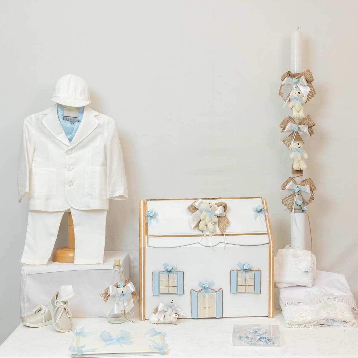 Italian baptism set with refined suit, scarf, hat, gift box, handcrafted shoes, guestbook, and premium accessories. Complete package with customizable baptism themes.