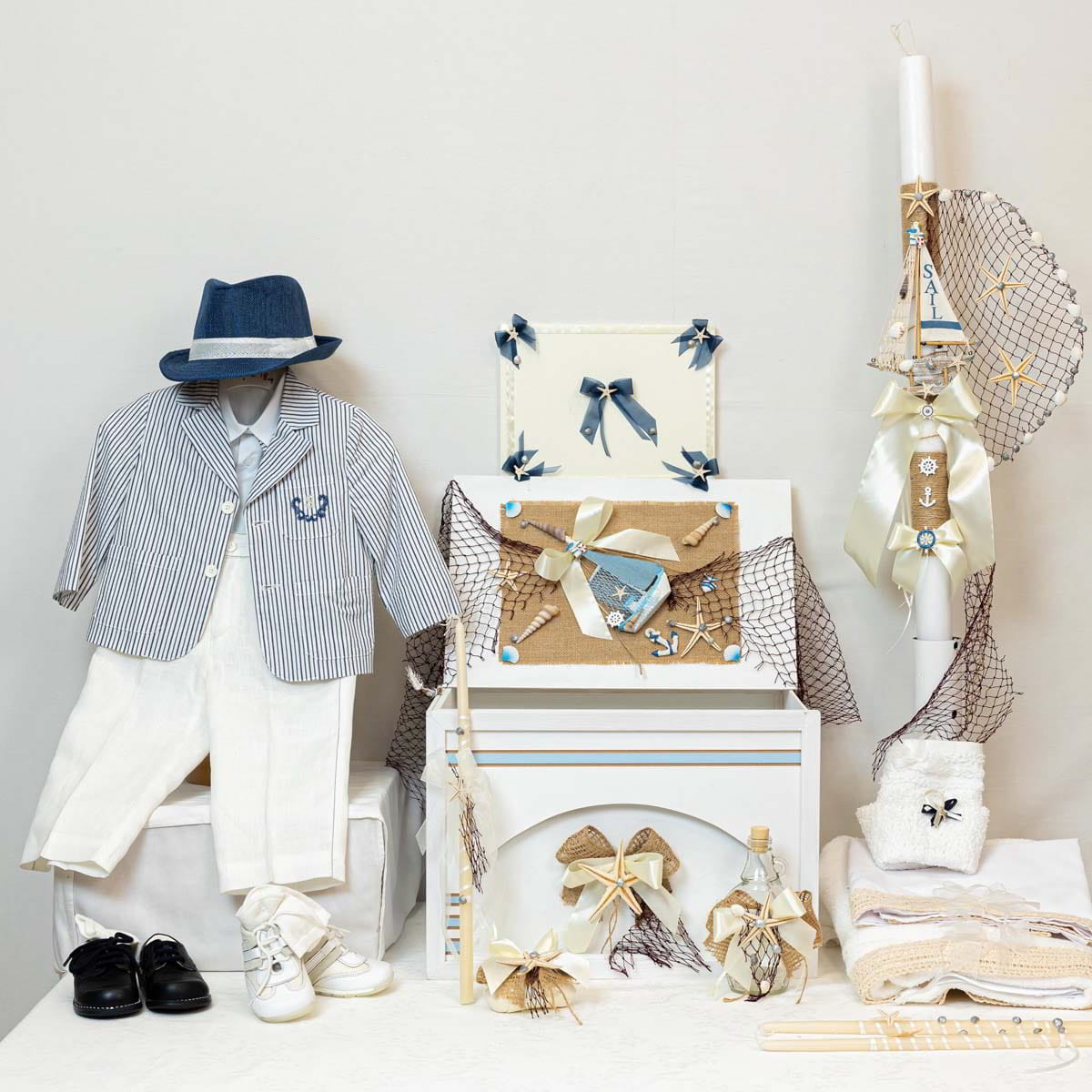 Italian baptism set with refined suit, hat, wooden gift box, handcrafted shoes, and wish book. All-in-one premium package with customizable themes.