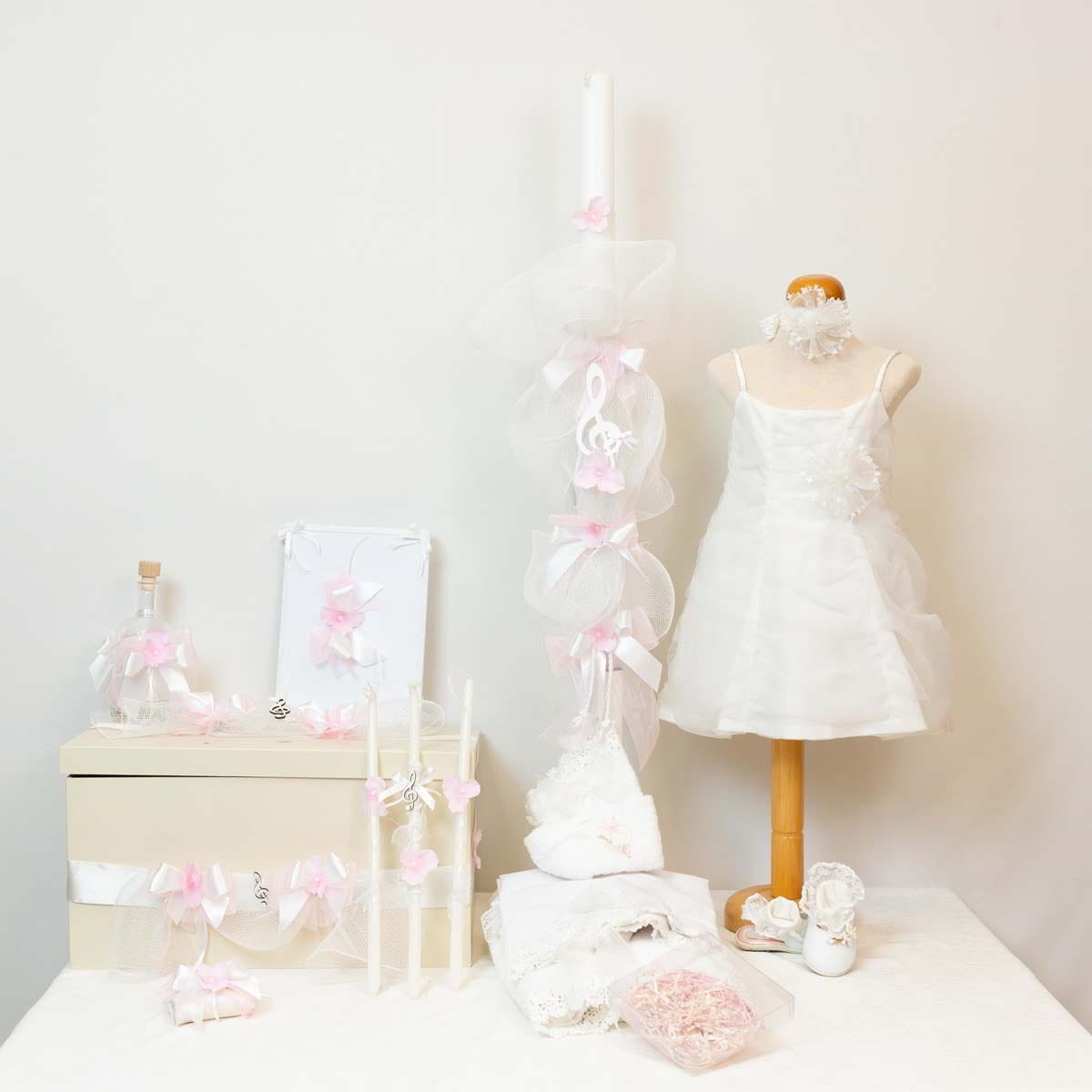 Nst Nastasia dress with ribbon GA8882, complete baptism package with handmade shoes, baptismal linens, candle, oil set, baptismal pins, and prayer book. Custom baptism themes available upon request.