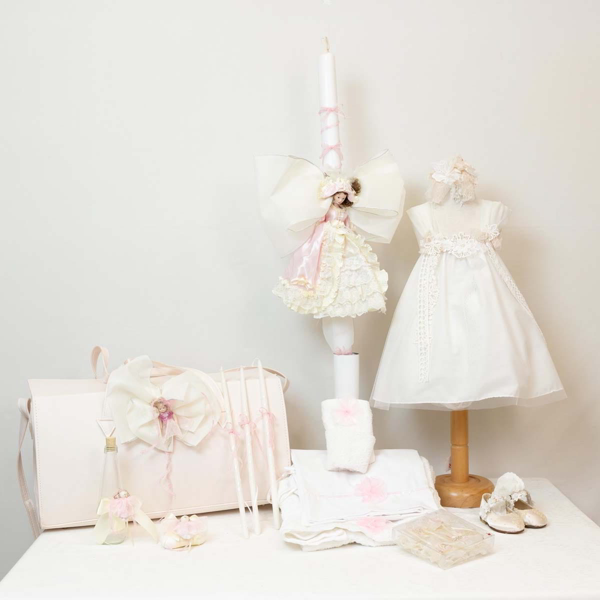 Το πακέτο της βάπτισης περιλαμβάνει όλα τα είδη της κούτας, το φόρεμα και την κορδέλα!