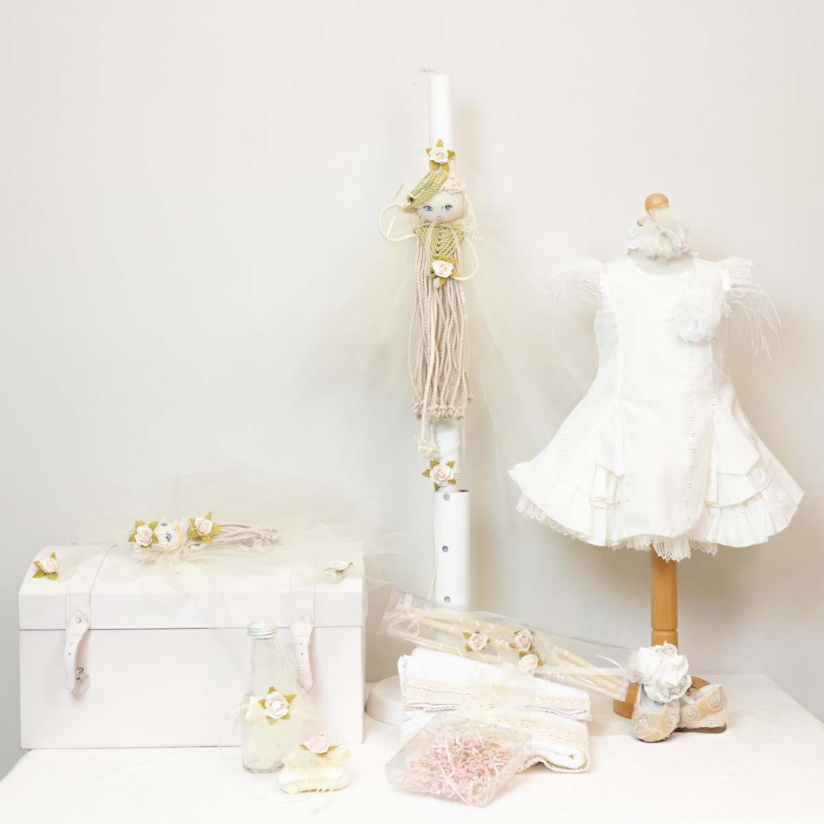 Το πακέτο της βάπτισης περιλαμβάνει όλα τα είδη της κούτας, το φόρεμα και την κορδέλα!